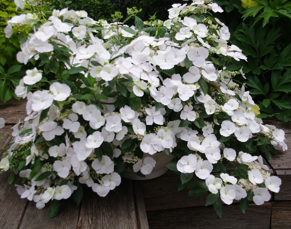 | Гортензия "Белоснежка" | Соцветия окаймлены большими, элегантными стерильными цветками чистого белого цвета, часто более розовыми в холодную погоду. Количество цветков на соцветие, стерильных от 8 до 10, плодущих 330. Естественный сезон цветения с апреля по июнь-сентябрь. Высота соцветия 8,5 см, ширина 13,5 см. Высота в среднем 50,0 см, ширина 100,0 см. | |