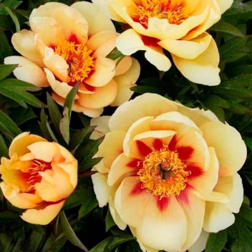 | Border Charm - самые красивые ито-пионы на вашей домашней клумбе. Селекционерам Японии удалось создать кремовые соцветия, которые внутри дополнены красными язычками и ярко-желтыми махровыми пыльниками. Листва долго сохраняет декоративный вид, а с приходом холодов приобретает багровый окрас. |