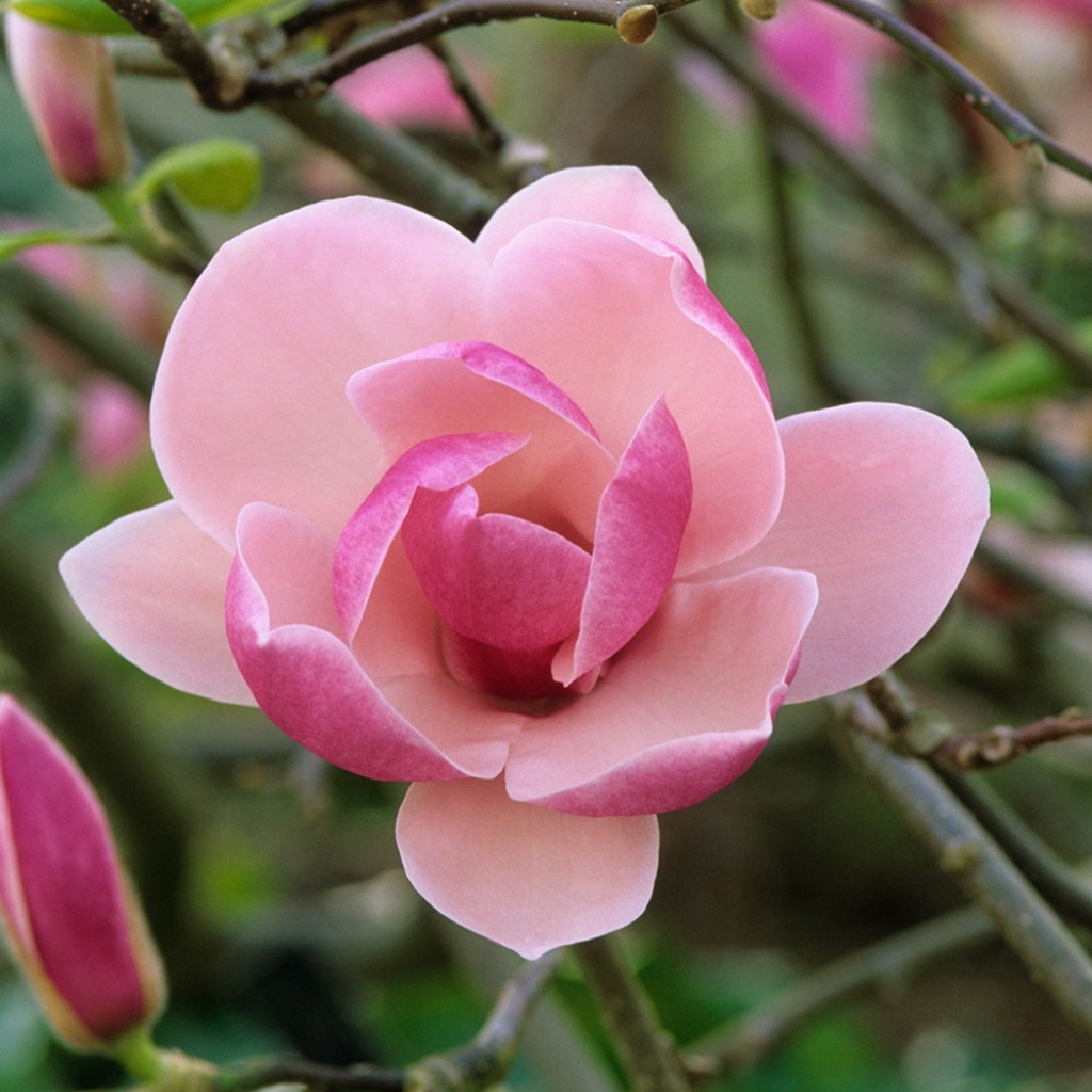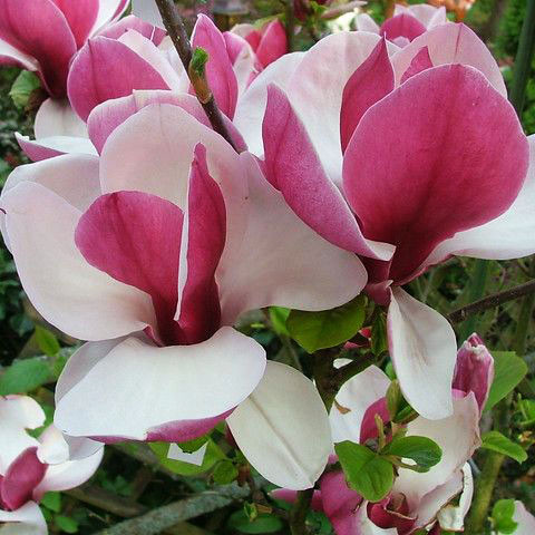 | Магнолия Ферст Лав (Magnolia First love) | Сорт магнолии с вертикальной формой роста до 4,5 м высотой. Цветки розово-фиолетовые снаружи и цвета слоновой кости внутри. Цветет очень обильно весной, в конце мая – начале июня, одновременно с развитием листьев. Предпочитает солнечные участки, защищенные от ветра. Сорт очень широко используют для украшения балконов и террас. | |