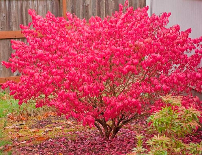 | Бересклет Европейский | Кустарник с прямостоячими ветвями, который осенью превращается в настоящее пламя — его листья окрашиваются в ярко-красные и пурпурные оттенки. Отличается декоративными плодами в виде розовых коробочек с оранжевыми семенами. Хорошо переносит стрижку и придаёт живую структуру саду. Может использоваться как живая изгородь или в одиночных посадках. Морозостойкий и неприхотливый, устойчив к засухе и вредителям. | |
