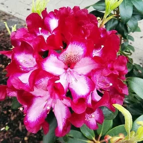 | Нежно-розовый "Миднайт" | Очень красивый вечнозелёный, среднерослый, плотный кустарник. С английского его можно перевести как «Мистическая Полночь». Цветки белые с ярко-малиновой каймой по краю волнистого лепестка и красным крапом. Листья эллиптические, зеленые. | |