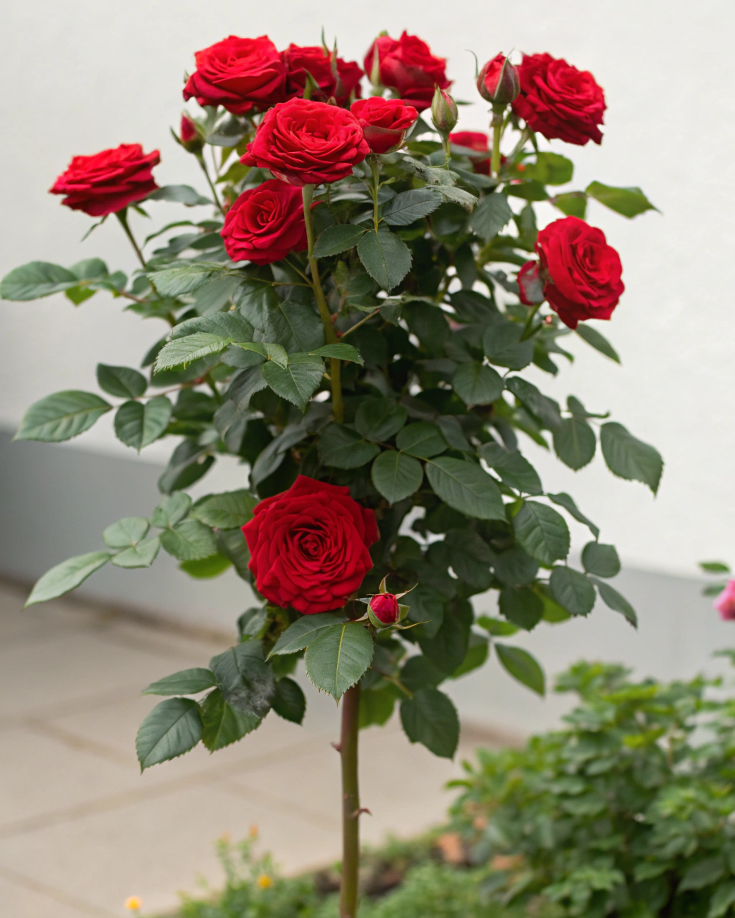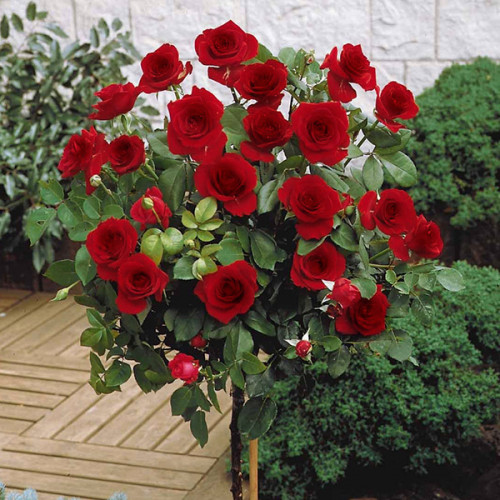 | Штамбовая роза Red Intuition | Яркий и необычный сорт с крупными красными бутонами, украшенными мраморным рисунком в виде светлых прожилок. Лепестки плотные, бархатистые, цветы долго держатся. Крона компактная, шаровидная, отлично смотрится на высоком штамбе. Устойчива к болезням, цветёт всё лето. | |