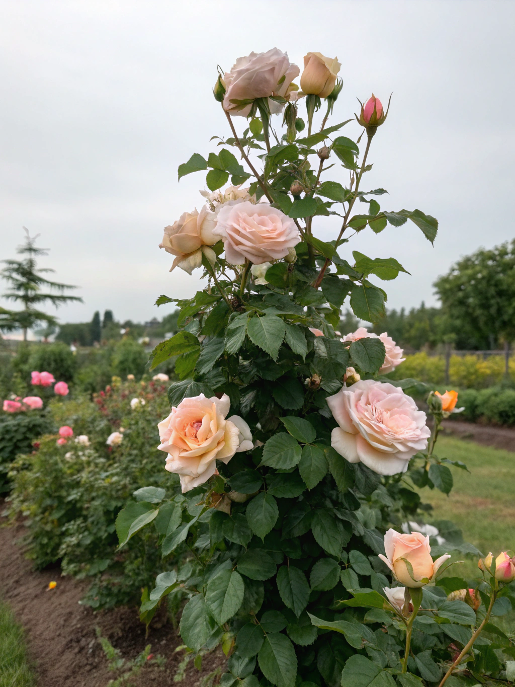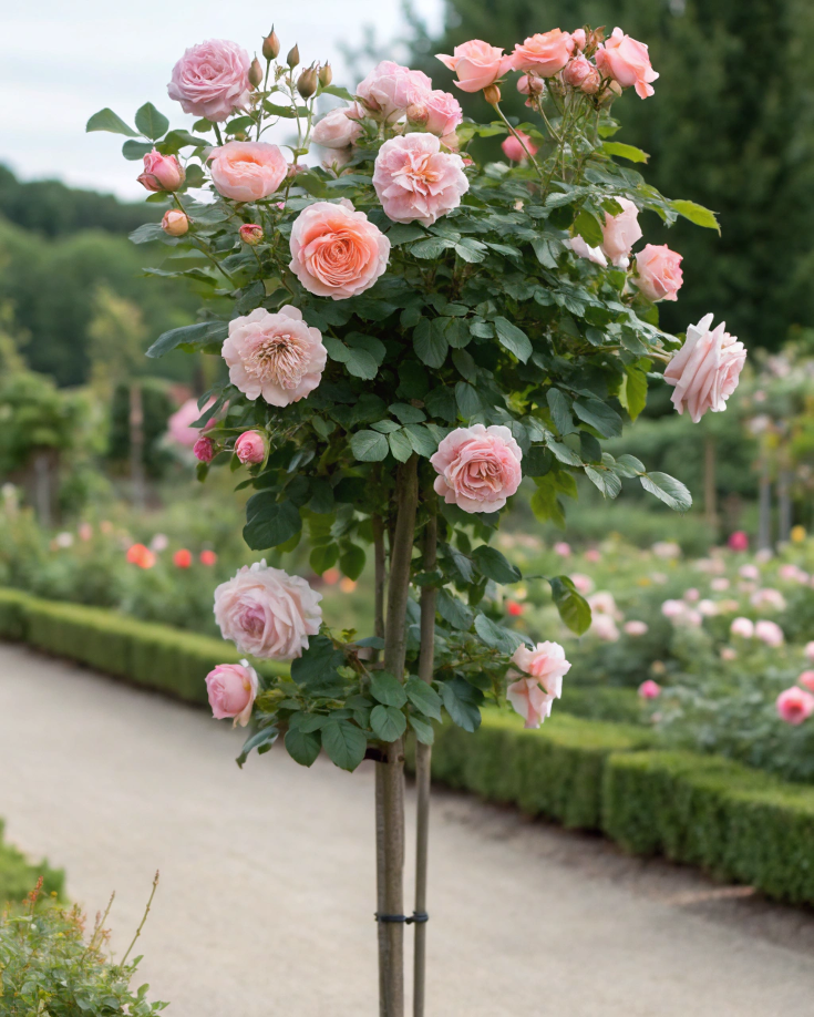 | Штамбовая роза Schloss Ippenburg | Редкий и выразительный сорт с крупными абрикосово-розовыми бутонами и сложной окраской лепестков. Цветы раскрываются медленно, долго не осыпаются. Образует плотную крону, обильно цветёт в течение всего сезона. Идеально подходит для элегантных садов и изысканных композиций. | |
