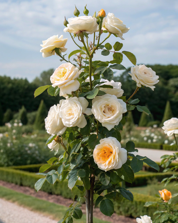 | Штамбовая роза Château de Versailles | Шикарный сорт с элегантными кремово-розовыми лепестками и аристократичным внешним видом. Цветки крупные, густомахровые, обладают нежным ароматом. На штамбе образует компактную, плотную крону. Идеально подходит для оформления торжественных зон и парадных аллей. | |