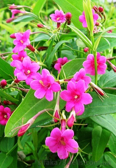 | ВЕНГЕЛА ЦВЕТУЩАЯ РУМБА (Rumba) | Листопадный кустарник с раскидистой формой кроны. В высоту вырастает до 1,5 м, шириной до 2, 5 м. Быстрорастущий сорт. Годовой прирост в высоту и ширину - 25 см. Листья эллиптической формы, длиной 4-6 см, темно-зеленые с пурпурными краями. Цветение начинается в июне. Цветы в форме обращенных вверх колокольчиков, собраны в соцветия по 3-4 штук, розово-лилового цвета. | |