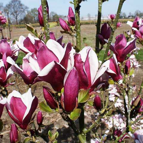 Магнолия Нигра (Nigra) — элегантный сорт с насыщенно-пурпурными, почти бордовыми цветами снаружи и светло-розовыми внутри. Цветки крупные, бокаловидной формы, источают лёгкий приятный аромат и появляются ранней весной, ещё до распускания листвы. Куст или небольшое дерево достигает 2–3 м в высоту, формируя аккуратную, округлую крону, которая прекрасно смотрится в одиночных посадках.