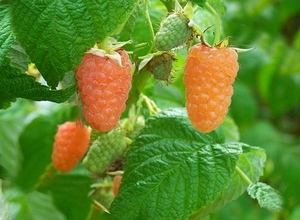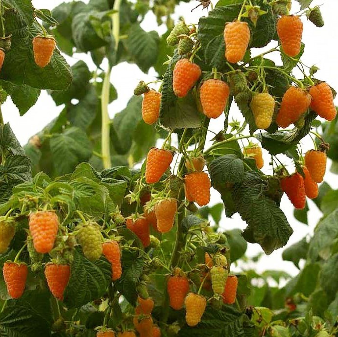 Сорт малины ремонтантный, универсального назначения, самоплодный. Ягода округло-конической формы, с мелкой костянкой, сочная, желто-золотистая, яркая, с ощутимым ароматом, десертного вкуса. Средняя масса 3,6-3,8 г. Срок созревания - начало-середина августа, плодоношение до заморозка. Шипы короткие, мягкие, средне сильный, не слишком раскидистый. Однолетние побеги светло-зеленые, имеют восковой налет. Высота куста - невысокий, до 1.4-1.5 м.
