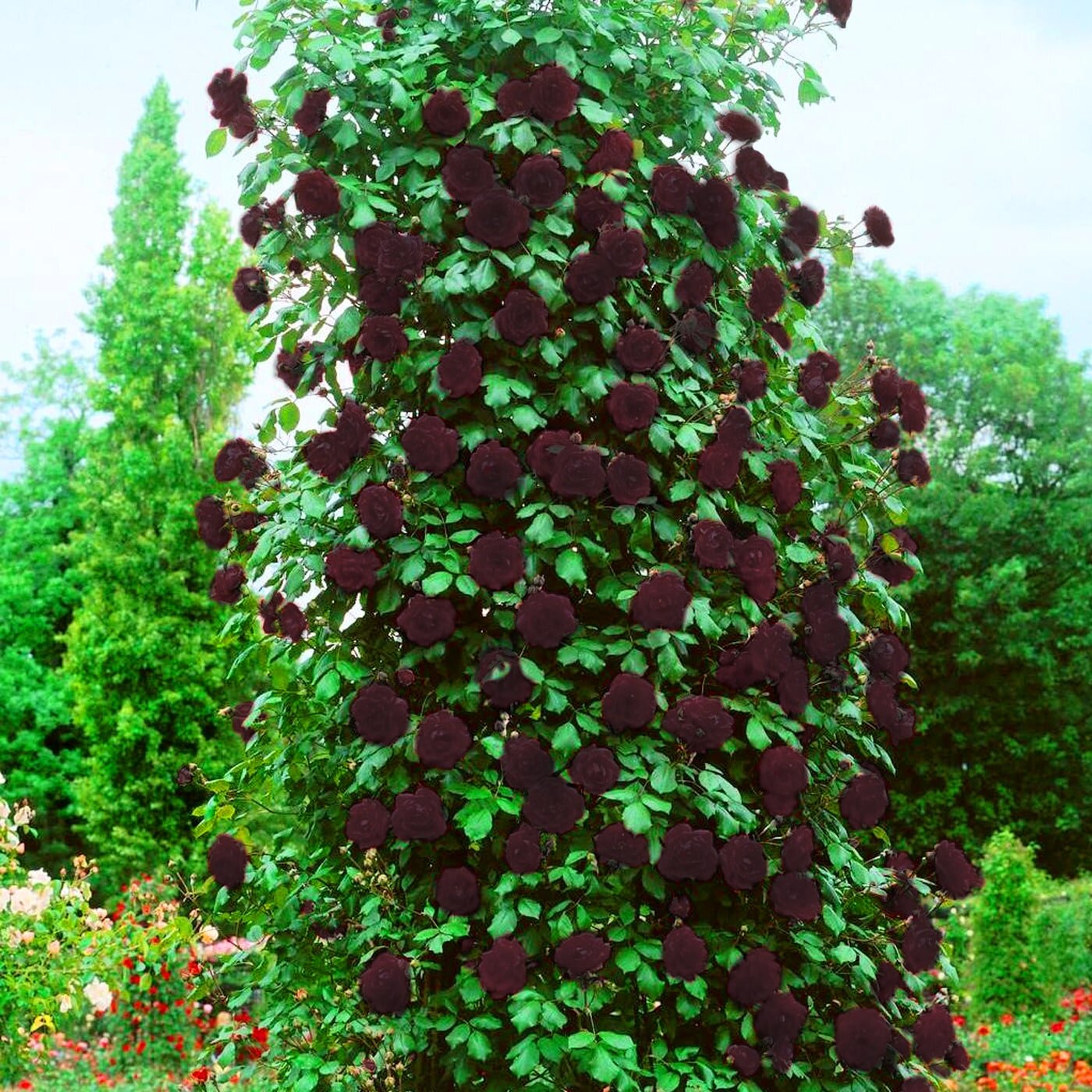 Штамбовая роза «Чёрная магия» — роскошный сорт с бархатистыми тёмно-бордовыми бутонами, которые при полном распускании становятся почти чёрными. Цветки крупные, плотные, с насыщенным благородным ароматом. Цветёт долго и обильно, волнами, радуя пышными кистями. Куст на штамбе выглядит эффектно и аристократично, прекрасно держит форму. Отличается высокой устойчивостью к жаре, морозам, дождю и болезням. Идеальна для парадных композиций, входных зон и срезки — цветы долго сохраняют свежесть в букете.