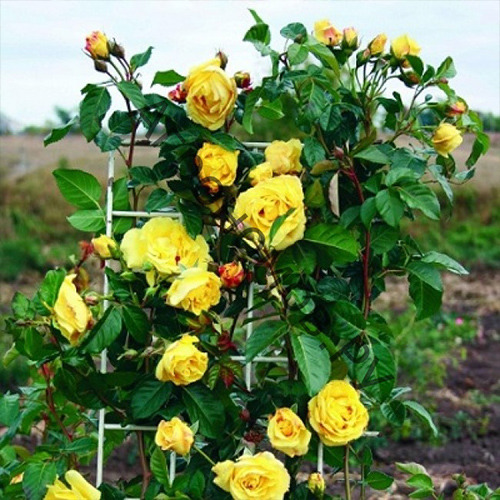 Штамбовая роза «Жёлтая кукла» — очаровательный сорт с крупными махровыми бутонами солнечно-жёлтого оттенка. Цветки густые, бархатистые, сохраняют яркость на протяжении всего цветения. Распускаются волнами с начала лета до поздней осени, излучая лёгкий сладковатый аромат. Куст на штамбе выглядит аккуратно и нарядно, словно миниатюрное деревце, усыпанное золотистыми цветами. Сорт отличается высокой устойчивостью к жаре, дождю и болезням. Прекрасно подходит для украшения садов, аллей и парадных зон, а также отлично смотрится в контейнерах и на террасах.