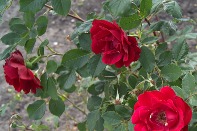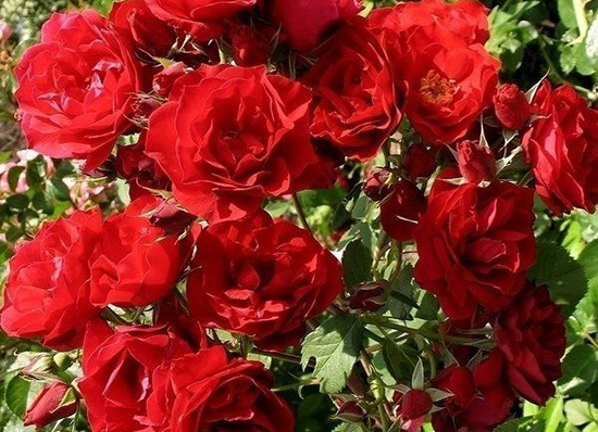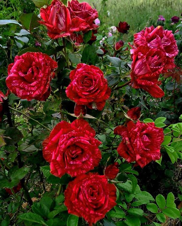 Мечта садовода: сохраняет красоту и форму в любых условиях. Цветки до 8 см в диаметре, густооблиственные, яркие, карминно-красные, атласный шелк лепестков имеет коралловый и темно-вишневый цвета. Куст компактный, округлый.
